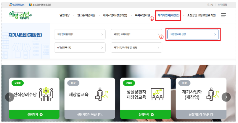1) [교육신청] ① 희망리턴패키지(hope.sbiz.or.kr)에서 재창업교육 신청, 선정 → ② 공단 지식배움터(edu.sbiz.or.kr)에서 e러닝 교육 수강